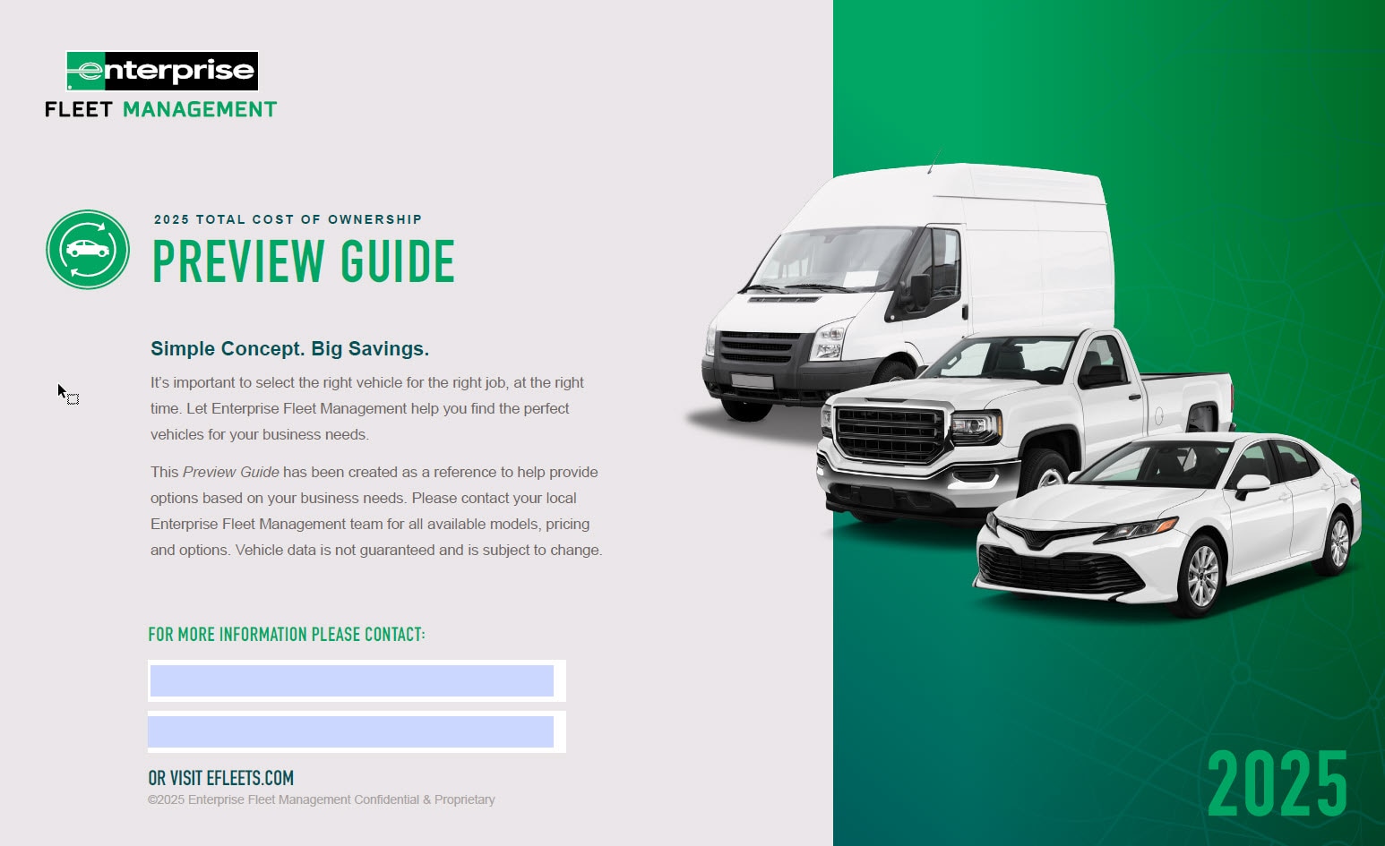 Simple Concept. Big Savings. It's important to consider the right vehicle for the job, at the right time. Enterprise Fleet Management builds a fleet preview guide comparing in-class make and models available as a reference for helping your business find the vehicle appropriate for your organization. Compare vehicle classes like cargo vans, pickup trucks, eco-friendly vehicle options and learn more about the total cost of ownership.